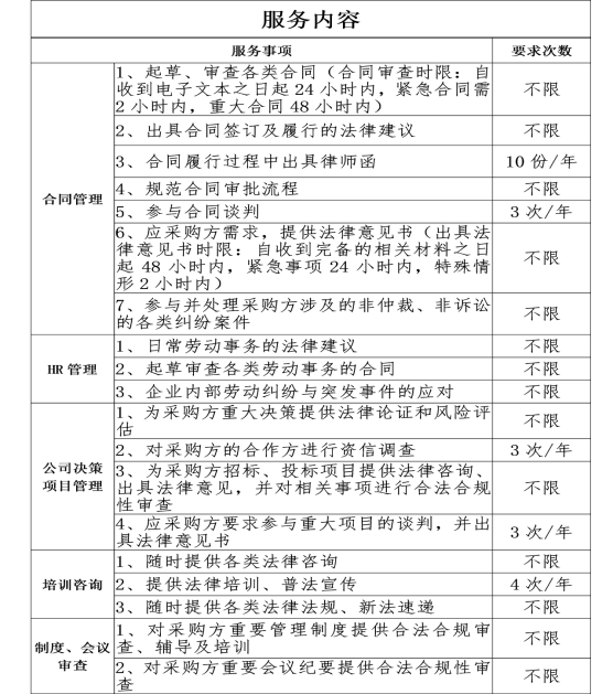 1、采購“法律服務(wù)”工作具體見《服務(wù)內(nèi)容表》(附表1);
